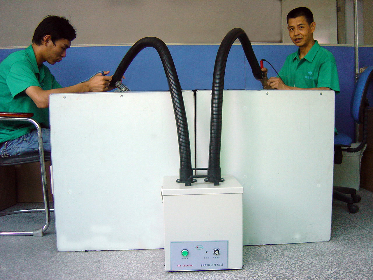 大多數的錫絲屬於無機化合物是一種低毒產品,短時間內接觸是沒有明顯的危害的,但長期接觸,或者錫煙濃度達到9.362mg/m3時,容易患錫塵肺,而且對神經有一定的毒害! 錫煙影響呼吸道初期問題有:正常呼吸有點困難,幹咳,但不會影響工作能力。中期:在呼吸上明顯有點困難,影響工作的發揮。末期:沒有辦法工作。這個時候消化道出現惡性,嘔吐,腹痛,便秘皮膚可出現潰瘍神經毒害,早期為精神萎靡,明顯乏力,後期為慢性頭暈,頭痛。 因此在長期接觸錫煙需要注意防護。SRA焊錫煙霧淨化機,采用點對點淨化,快速、精準、便捷。萬向吸煙手臂,可隨意拉動固定,無需安裝管道,無需外排,淨化後達室內排放標準。根據工位安排可以選擇多種安裝方式。 1.單工位焊錫煙霧淨化機,適合零散、少數工位。