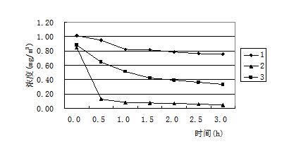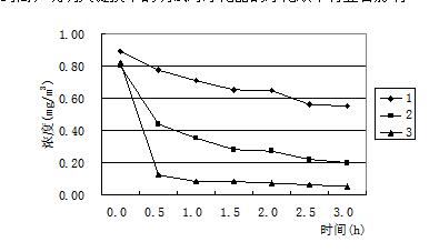 圖2 比較(圖2)中的三條淨化效率曲線可以看出,在相同的測試條件下,使用相同的技術,但是淨化效率卻有很大差異,2號產品能使甲醛濃度迅速下降,1h內即達到0.1mg/m3以下,可是1號產品在開啟3h後,甲醛濃度依舊在0.7mg/m3以上。許多研究表明,光催化可以在常溫常壓下即可將空氣中的有害氣體分解成無毒物質[7],而且沒有二次汙染,是一種有效的去除各種室內汙染物的先進技術,但在茄子AV网站測試的同時檢測環境艙內的臭氧濃度,發現臭氧濃度在光催化技術的淨化器淨化過程中均有不同程度的升高。這說明在考慮選擇光催化淨化產品的同時,不應該忽視其副產物臭氧的存在。另外光催化產品還存在催化劑失活的現象。催化失活是指催化劑表麵被反應產物或顆粒物覆蓋,失去催化效果,必須及時更換核心部件。因此如何選擇副產物的生成量較小,並且壽命較長的催化產品是催化劑類淨化器選型的關鍵。同一台淨化機改進前後淨化效率的比較 由於同種技術的淨化效果會因為設計工藝或者製造技術的不同形成較大差異,所以很多淨化器廠家也在不停的改進生產,希望可以得到效果好、副產物少、壽命長的產品。圖3中表示的是一家使用複合式技術廠家生產的淨化產品,主要采用的技術有過濾、吸附、高壓靜電和負離子,(圖1、2、3)中曲線分別是同一台淨化器未經過改進和兩次改進後得到的淨化效率曲線,三次試驗時淨化器內部結構基本相同,隻是在關鍵技術處做出調整,測試時得出的淨化效率有明顯差異。從圖中可以清晰的看出,三條淨化效率曲線明顯由低到高,說明關鍵技術的調試對淨化器的淨化效率有顯著影響。