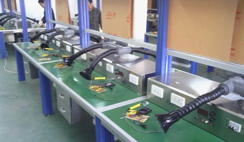 外排和室內淨化簡述: (1):外排方式: 整體布管根據實際情況使用不同的風機,通過分次布管接到各個焊錫工位,通常主管直徑在30CM左右,分到次管直徑為5CM到10CM之間,前麵也需要加上喇叭口之類的吸煙罩以達到更好的吸煙效果,風機功率在7.5千瓦左右。一個7.5千瓦風機能帶上20個左右焊錫工位![茄子视频懂你的更多] (2):通過煙霧淨化設備淨化後直接在室內排放: 采用煙霧淨化設備直接將煙霧廢氣完整的吸過來,經過淨化處理達室內空氣質量標準,可直接在室內排放。